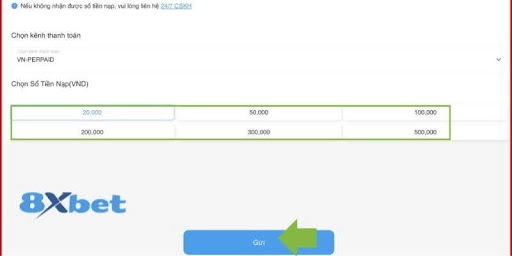 - Khi thực hiện nạp tiền, hệ thống nhà cái 8xbet sẽ hiển thị giới hạn ngay trên bảng nạp. Khi nhập số tiền, người chơi chỉ cần bỏ qua 3 số cuối cùng của số tiền muốn nạp. Chẳng hạn như để nạp 1.000.000 đồng, người chơi chỉ cần nhập 1000, nhà cái cho phép nạp tối đa 150 triệu đồng cho mỗi giao dịch.